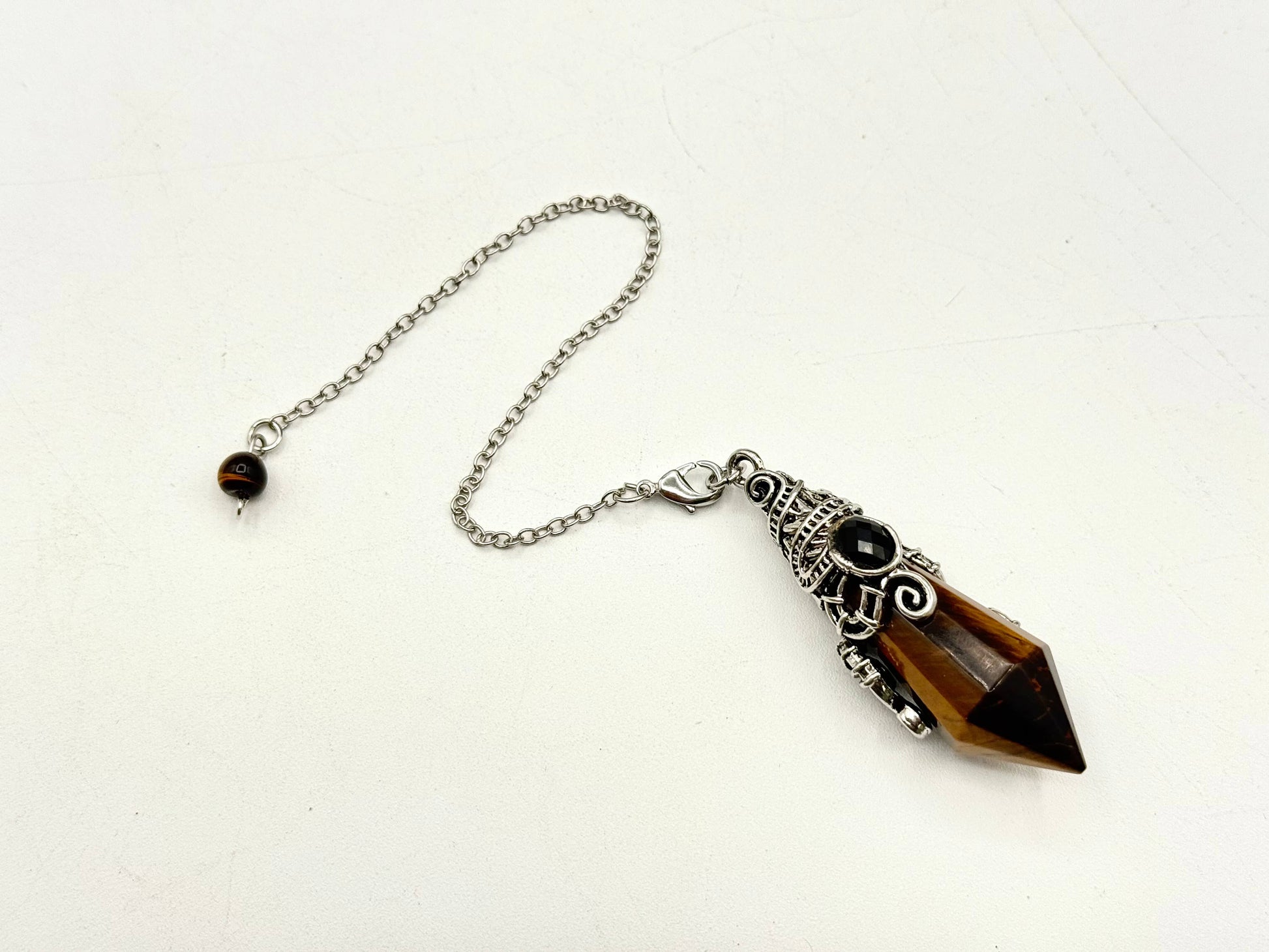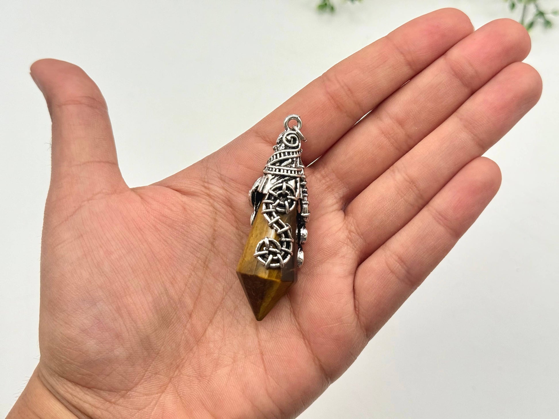 Beautifully crafted from all-natural Tiger Eye, this 12-faceted hexagonal pendulum features antique silver accents and a silver-plated chain with a lobster clasp. Ideal for divination, energy work, or as a unique crystal necklace.